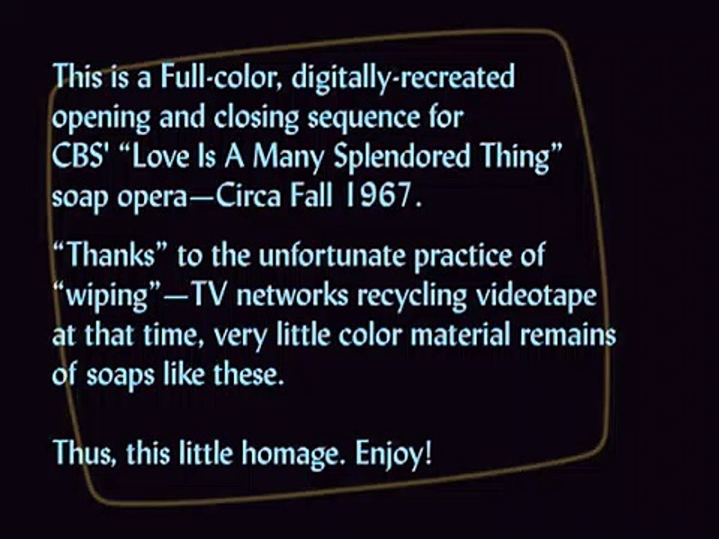 , This is a FULL-COLOR, DIGITALLY-RECREATED opening and closing for CBS' "Love Is A Many Splendored Thing" soap . ""Love Is A Many Splendored Thing"\u2014Soap\u2014Opening And Closing Version 2 (DIGITAL COLOR RECREATION)", This is a FULL-COLOR, DIGITALLY-RECREATED opening and closing for CBS' "Love Is A Many Splendored Thing" soap . If you're searching for Love Is A Many Splendored Thing Soap Opera subject, Love is a Many Splendored Thing March 1973, Some scenes from one of the final episodes of the fondly remembered soap opera "Love Is A Many Splendored Thing." Sadly . you have visit the ideal site. Our web always gives you hints for seeing the highest quality pic content, please kindly hunt and locate more enlightening articles and pix that fit your interests.